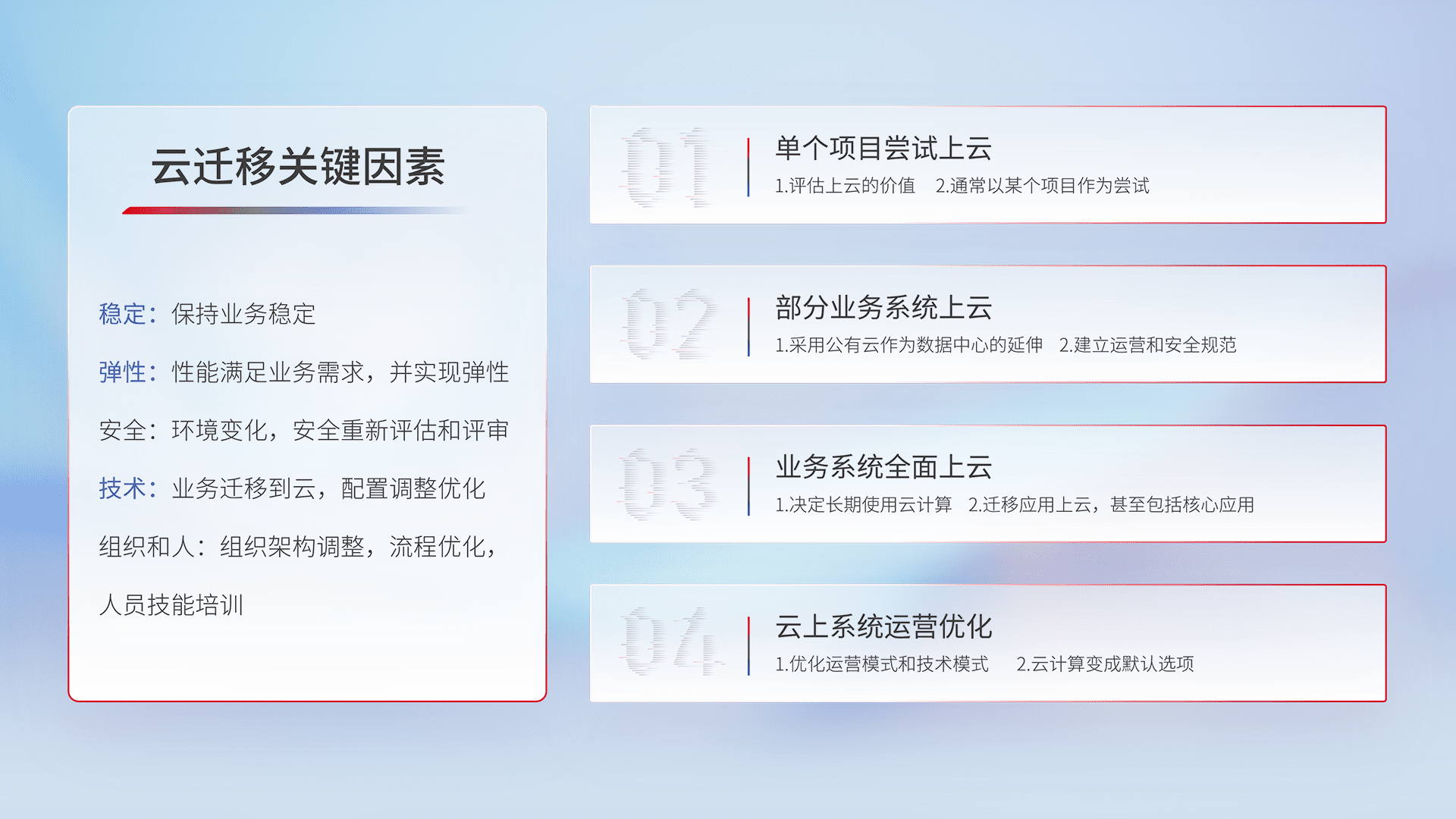 结合实际业务,,从规划设计、、、、云平台选型、、、云原生改造、、数据迁移、、、集成交付,,,,迁移全过程为客户识别最佳上云路径,,,,做好风险识别管理,,,,设计网络架构、、、身份权限、、、安全审计合规、、、、操作审计、、、、日志审计、、监控告警策略、、、、多站点容灾设计等,,,,对云上基础设施进行整体规划,,,提升IT治理水平,,,,以满足弹性、、高可用、、高性能的需求。。。。