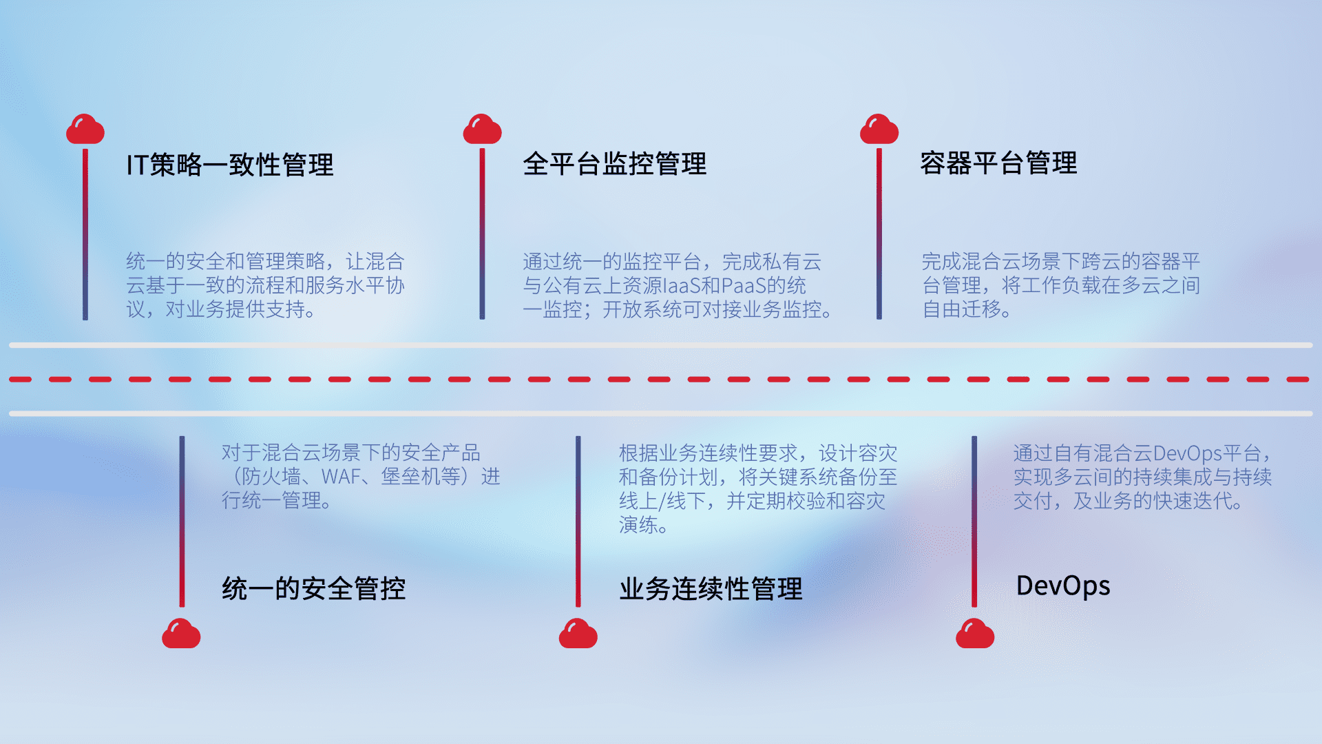 通过多云纳管,,,,以统一的资源数据模型把客户的云资源进行抽象和封装,,,,进而实现对多云资源的统一操作,,,保障云资源管理的可靠性、、、稳定性与可用性。。量身定制化运维内容,,,,配置、、、、开发运维、、、补丁管理、、、备份、、、、监控、、、认证和访问管理、、、、审计和日常巡检等,,,保障在用云过程中的可靠度,,稳定度以及高可用率。。。