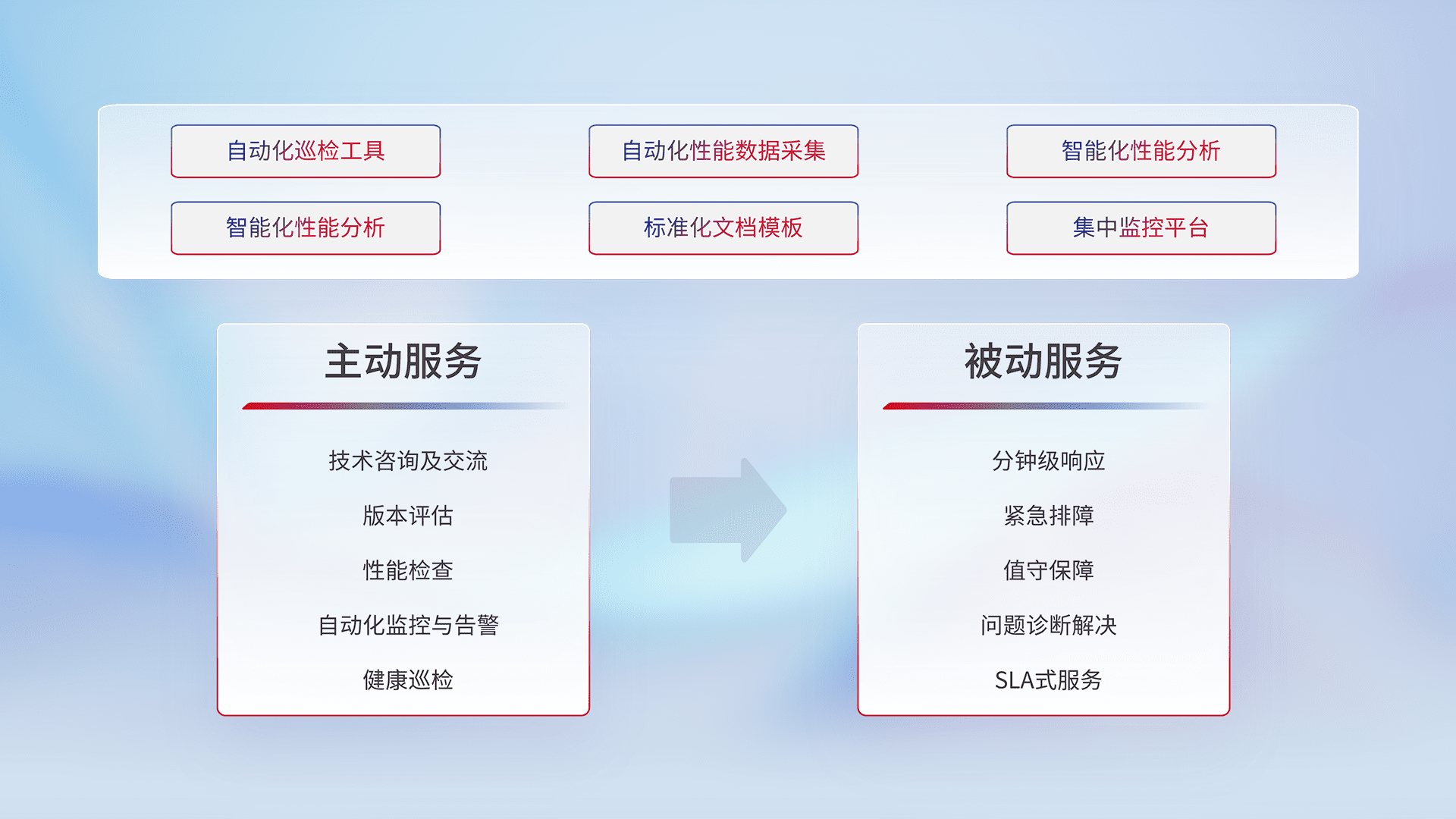 智能化工具和标准化文档,,,保障服务质量,,,,提供主动服务(包含技术咨询、、版本评估、、、性能检查、、自动化监控与告警、、健康巡检)和被动服务包含(分钟级响应、、、、紧急排障、、、值守保障、、、问题诊断解决、、、SLA服务)。。。